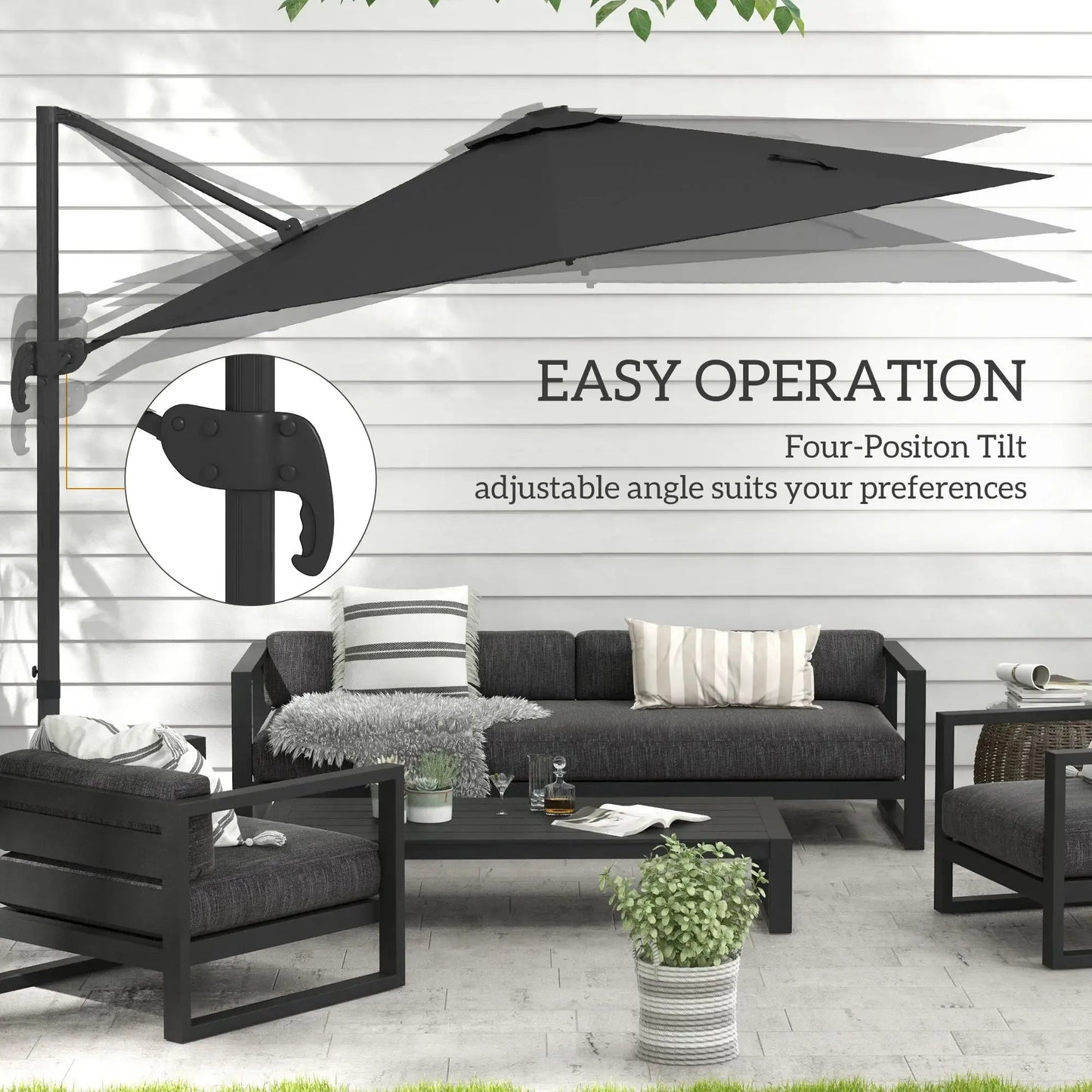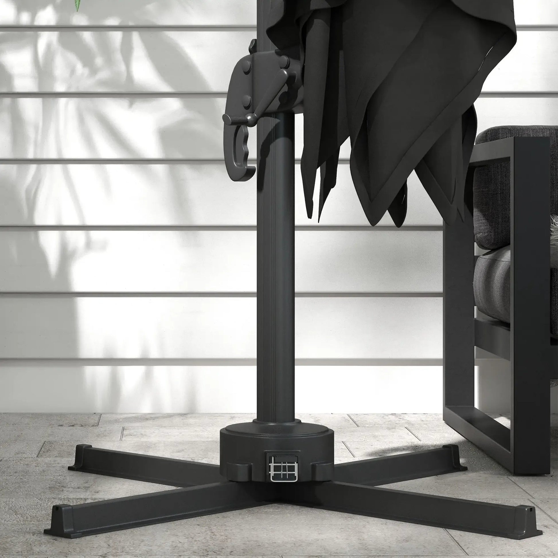 With a crank handle for smooth opening and closing, a foot pedal for 360° rotation, and a four-position tilt mechanism, you can adjust the canopy to suit your needs throughout the day. A cross base is included, but please note that weights are required and not included—a counterweight of 90–110 kg is recommended.