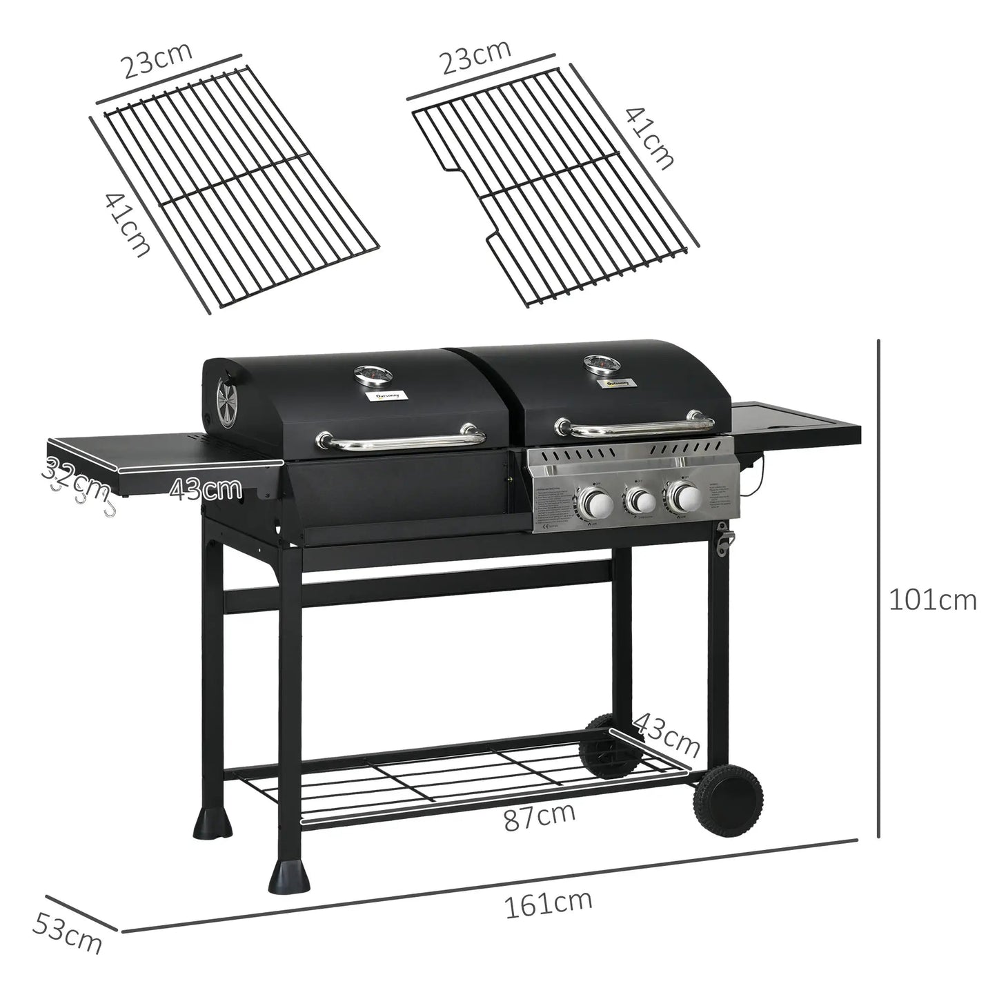 Fire up your garden parties with the versatile Outsunny charcoal and gas combo grill! The charcoal grill with lid can make authentic smoky flavour and a 2-burner gas grill for convenient cooking. A handy side burner adds extra cooking flexibility. With a spacious cooking area, it's enough for feeding 8-16 people, making it the centrepiece of any social gathering.